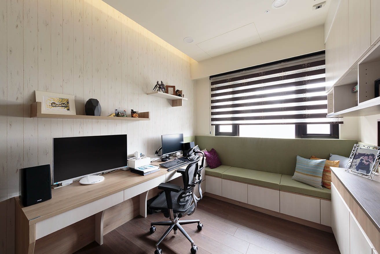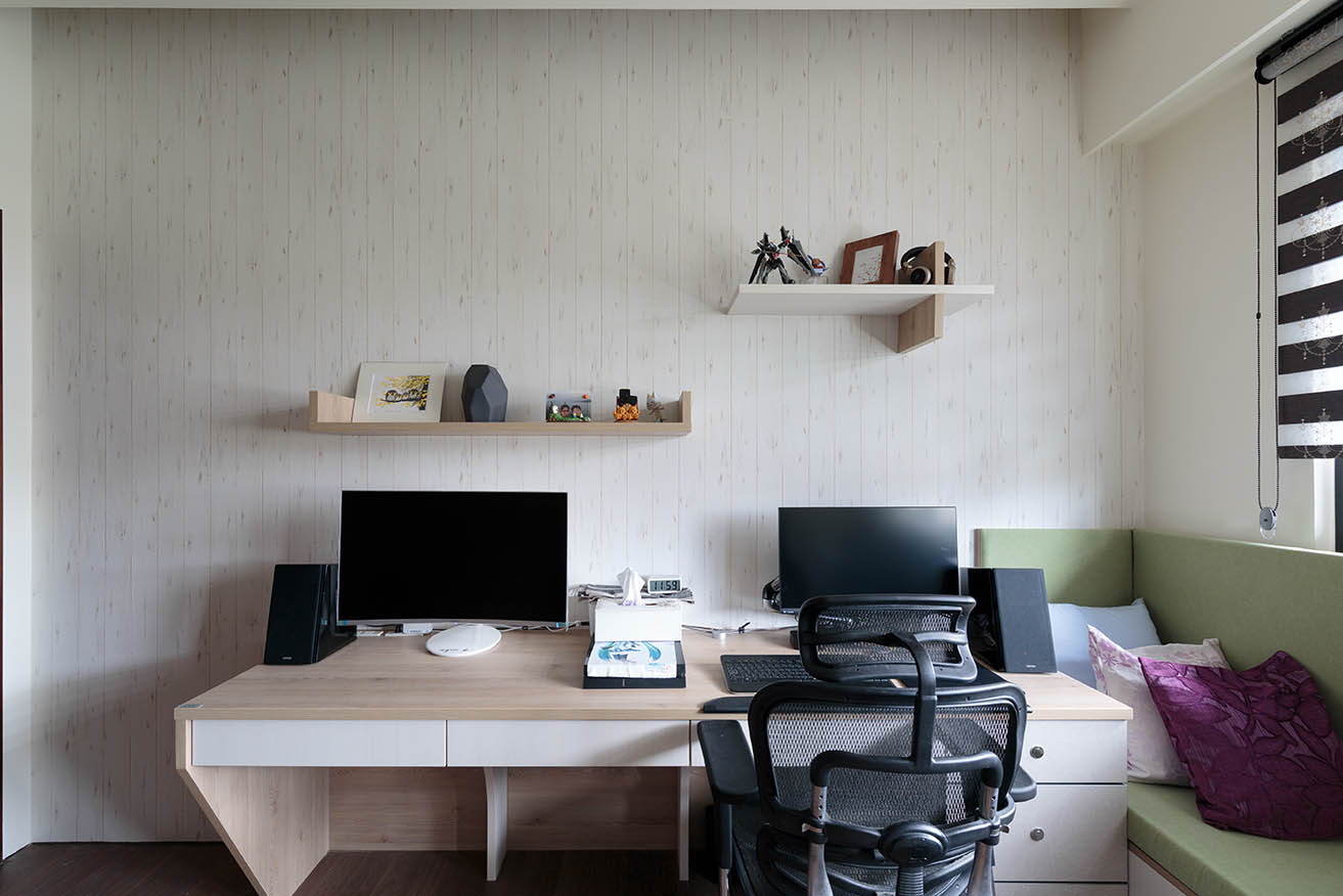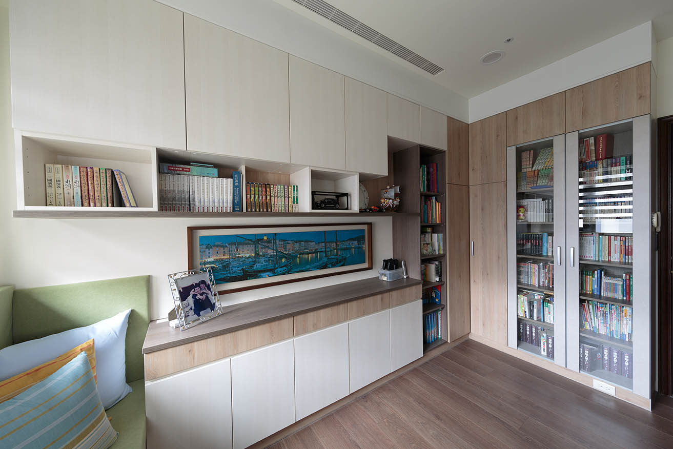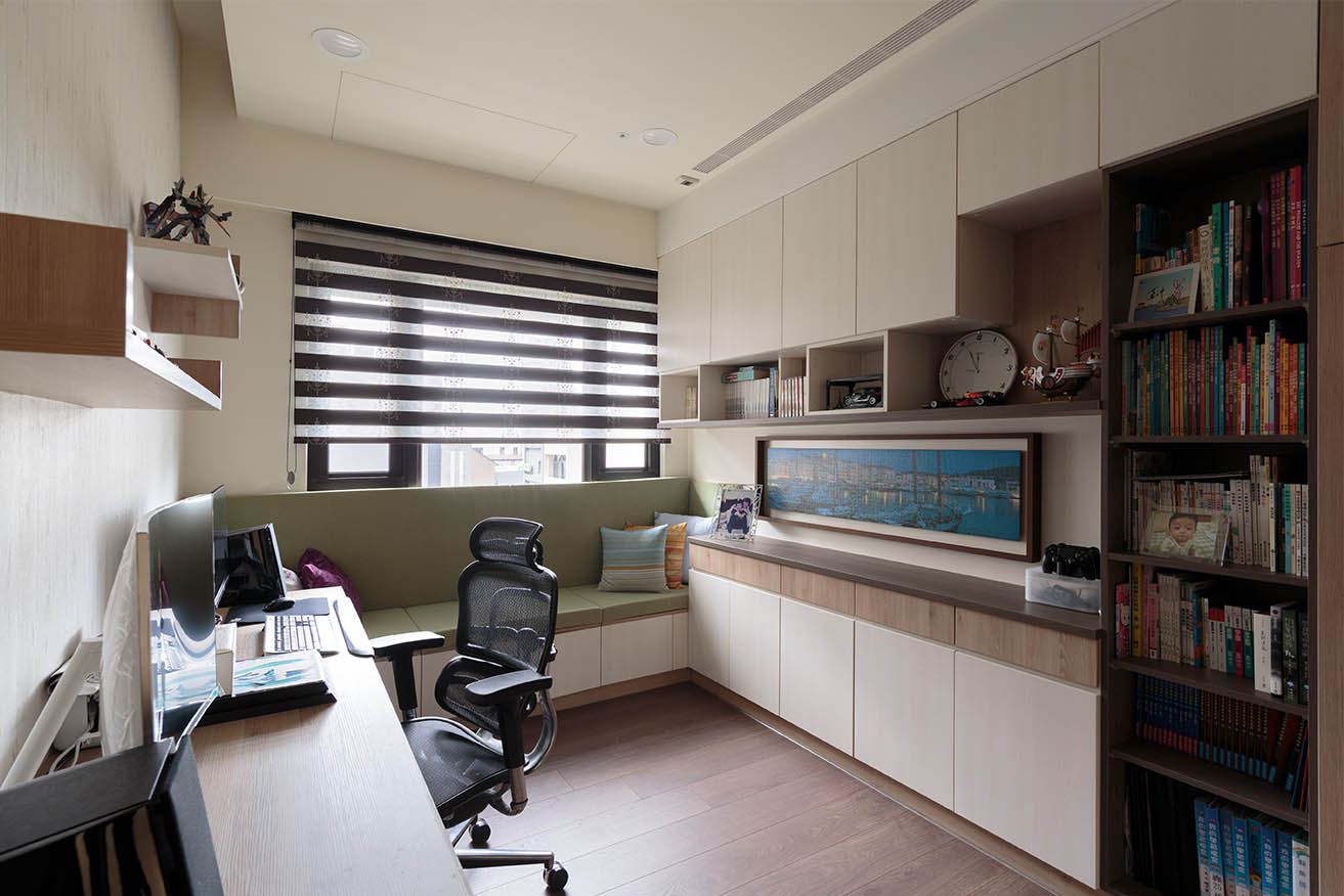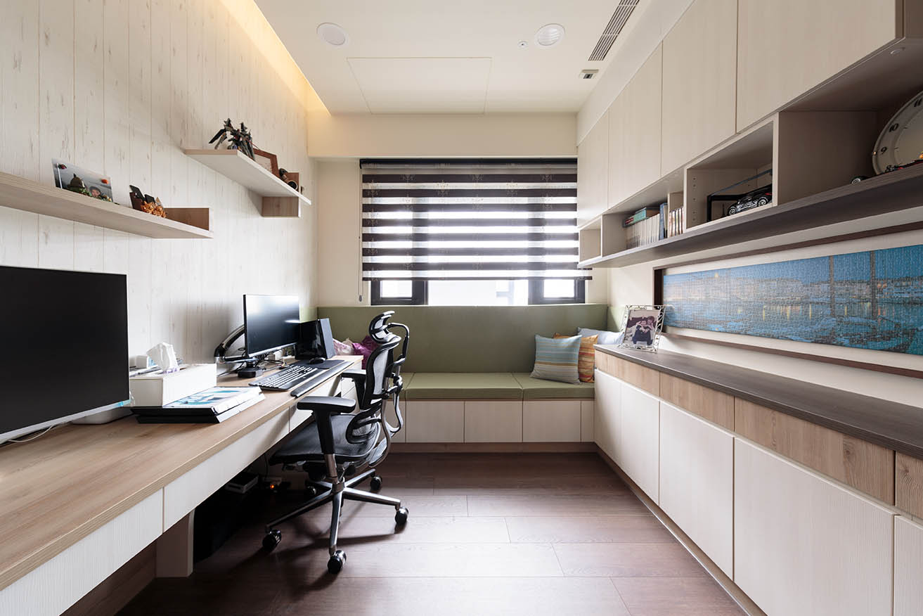 另一側切齊樑柱砌築一整面兼具收納與展示的多功能書櫃,讓屋主可擺放小孩照片、收藏品及掛畫,打造帶有個人情感的風格裝飾。窗邊規劃收納臥榻,抹茶綠椅墊為木質系空間點綴日式清新感,考量左右兩側前方都有櫃體擋住,因此配置左右為上掀式、中間為門板的收納方式,符合空間使用效益。以系統板材構築的長型書桌與展示層板,搭配仿木紋質感的壁布,營造清爽溫潤的閱讀辦公氛圍。