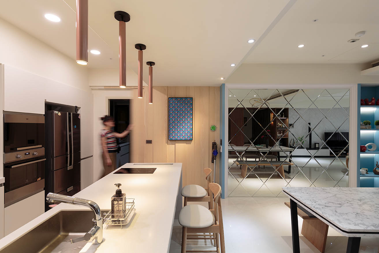 以仿大理石紋的磁磚和系統板材取代,砌築具有石材質感又能映襯屋主獨有品味的現代輕奢宅,考量小孩還在就讀小學,門板均以無把手設計打造安全舒適的成長環境。