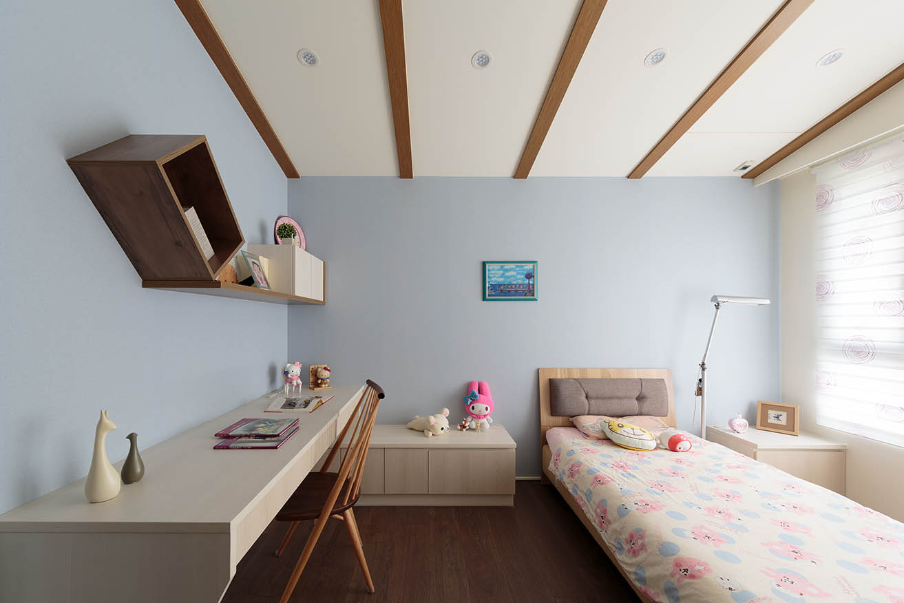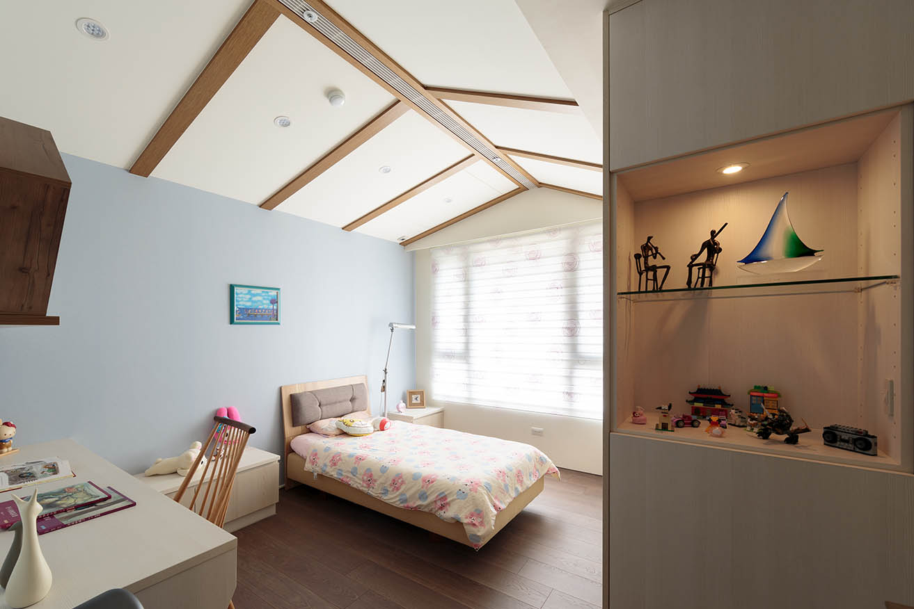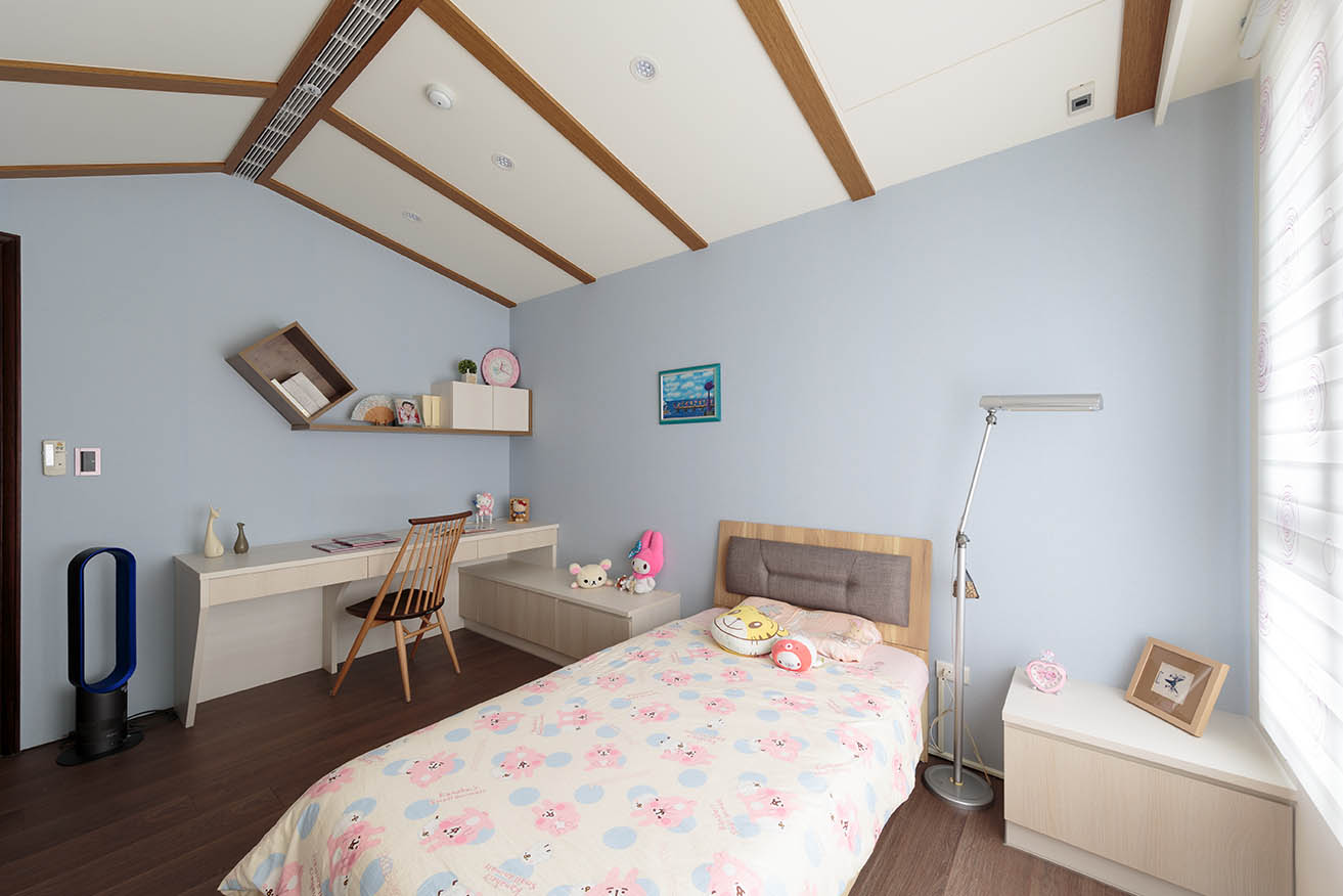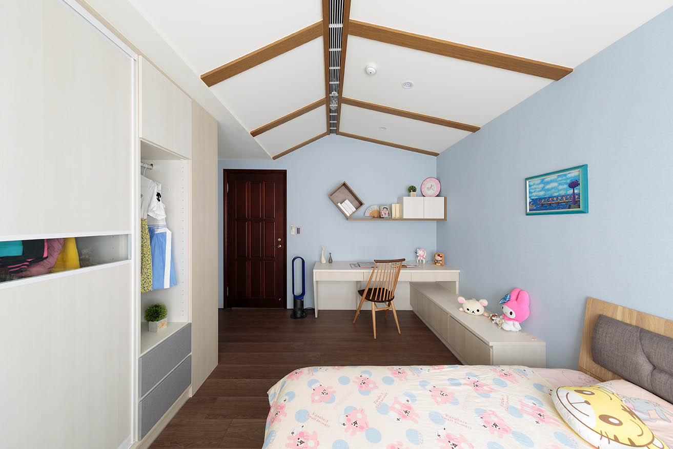 女孩房的衣櫃上方有巨大樑柱的問題,除了在樑柱下方打造一整面衣櫃外,利用小木屋造型的斜面天花板修飾掉巨大樑柱的窘境,並以木建材做出線條設計,形塑出有趣的造型感。
