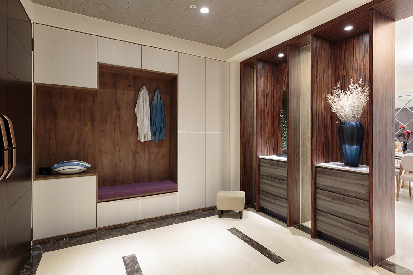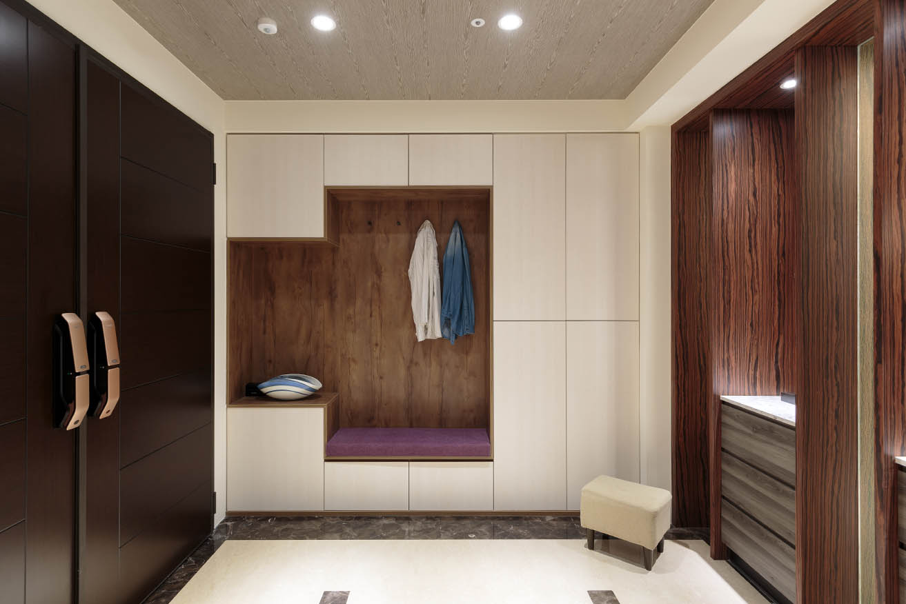 左側沿空間規劃一整面整併收納外出服、穿鞋椅的鞋櫃,米白色門板搭配深色木紋背板呈現簡約典雅質感,右側同樣依循樑柱、牆面打造一整面頂天立地的鞋櫃,採用無把手隱藏門板,深棕色的大面積木紋讓視覺產生延伸及份量感,內部配置層板,方便儲放多雙鞋子。