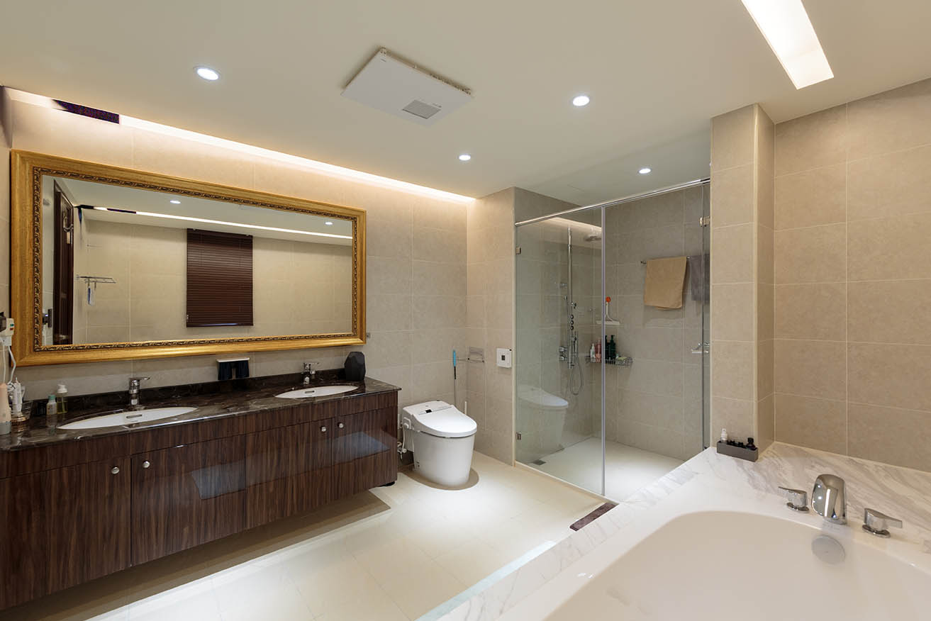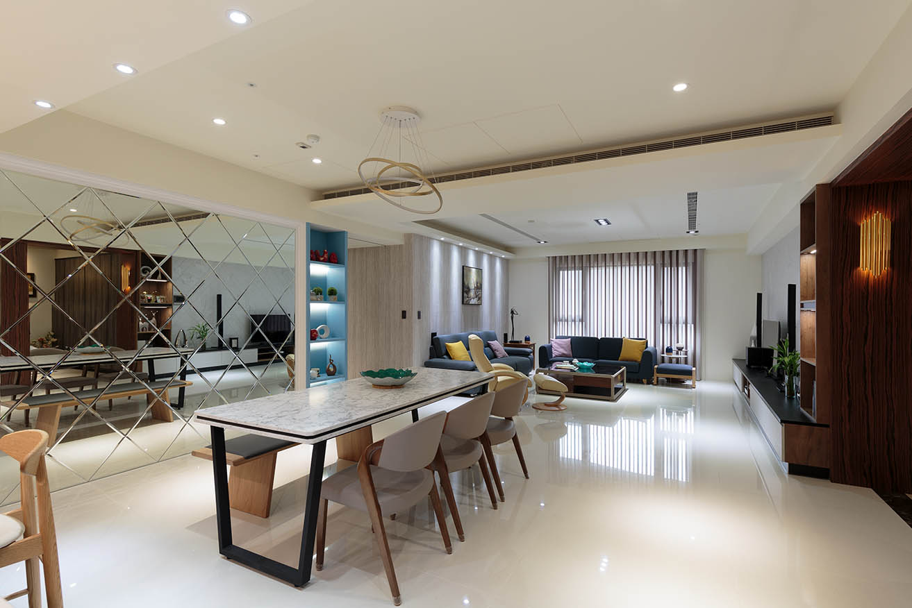 以現代風簡約自然的色調構築空間基調,因部分區域運用到石材質感的材質、鏡面、磁磚等,為避免空間過於冰冷,以仿木紋的壁布和木紋系統板材加以調和。