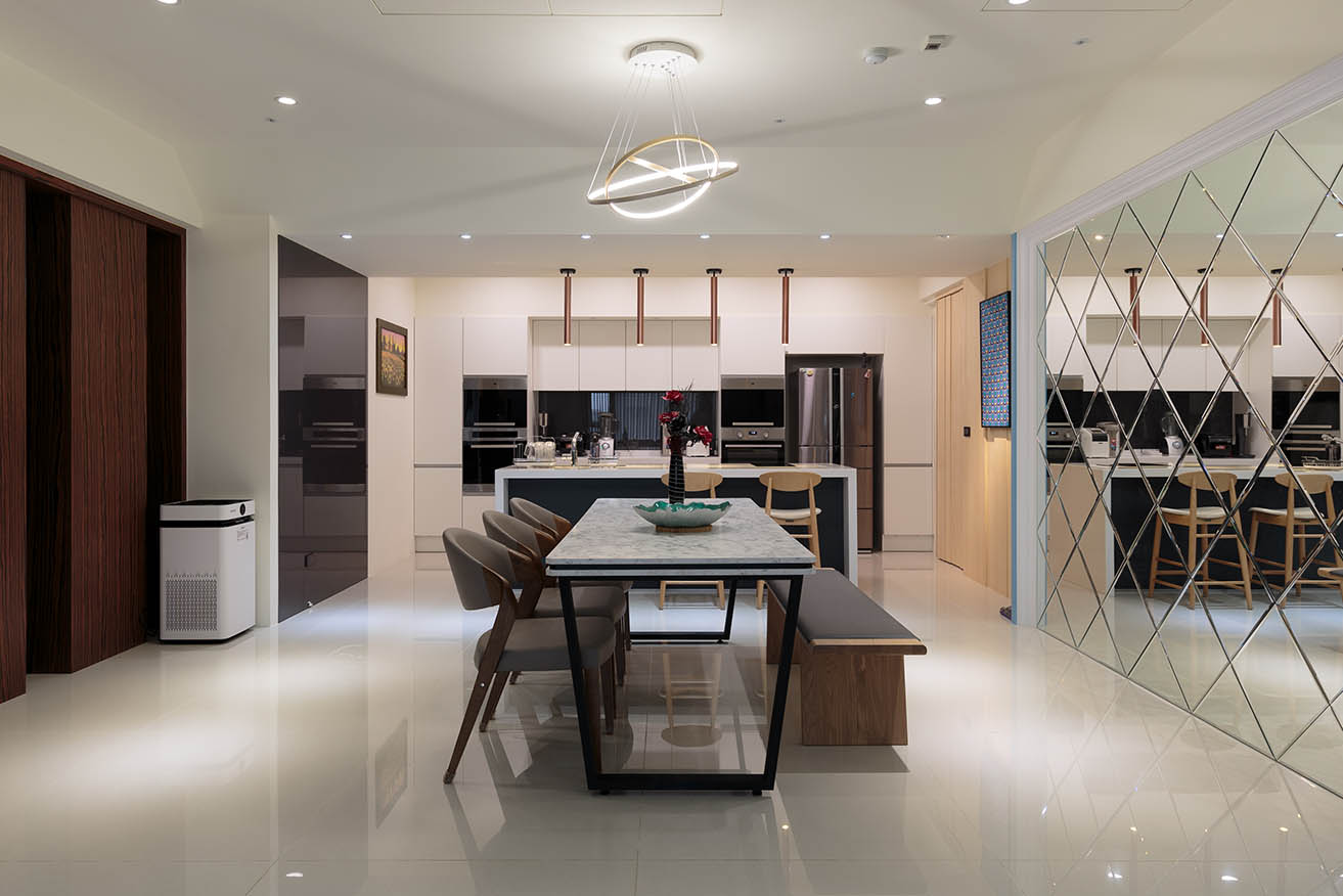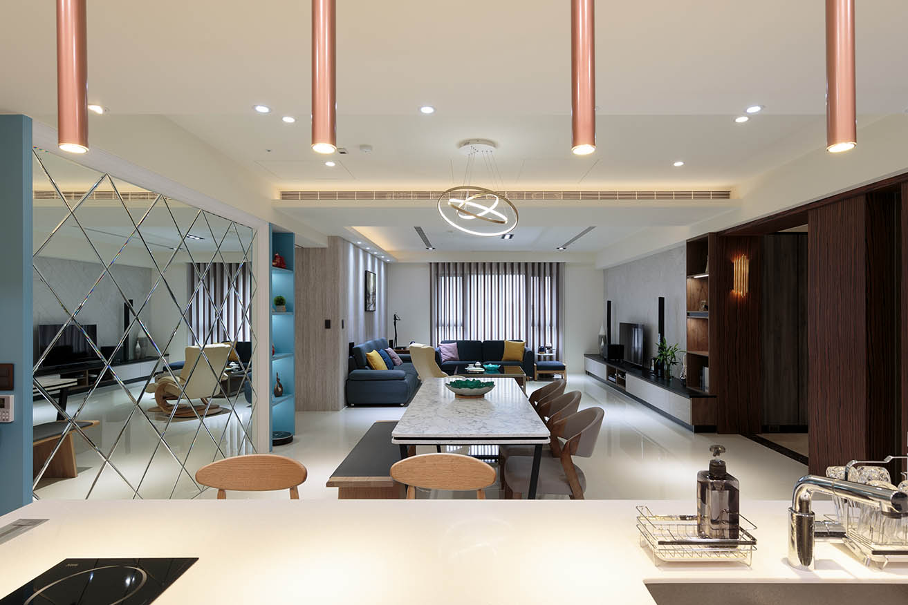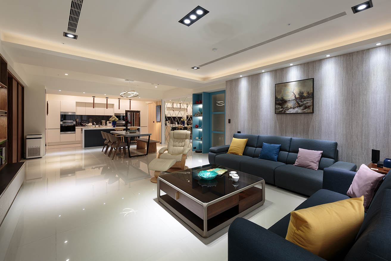 全室具有良好採光,每個房間都有對外窗,因此主要以自然光崁燈加強照明,公領域天花板及櫃體則以和煦黃光的間接照明烘托氣氛,餐桌及中島上方特地挑選簡約感設計的造型吊燈,讓寬敞空間中增添視覺份量。