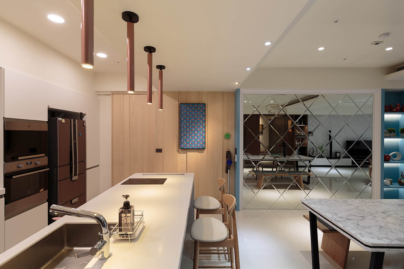 鏡面左側以淺色的木製隱藏滑門區隔熱炒區,不規則的凹凸門面設計除了增添造型變化外,亦能做為開關門的把手。