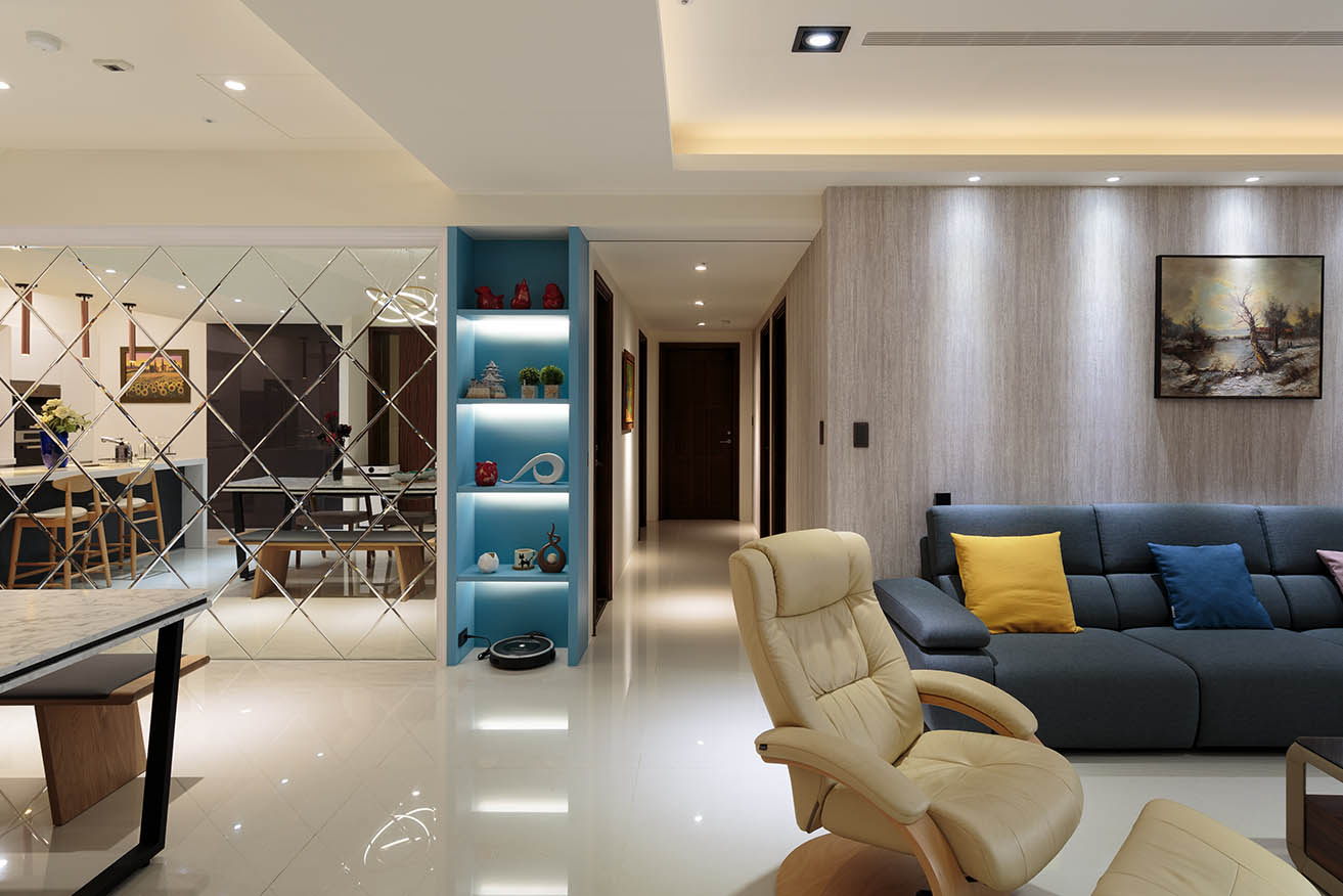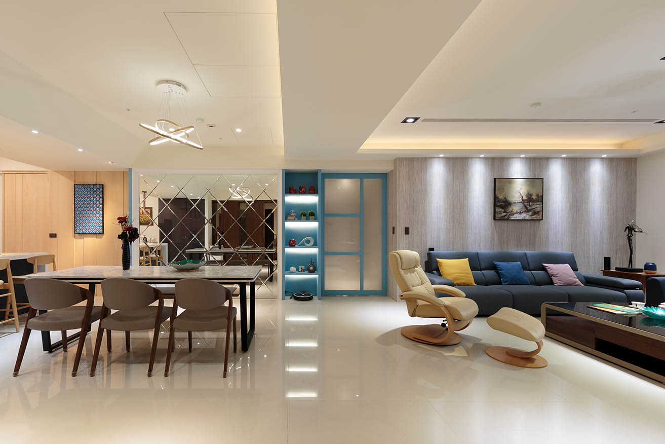 公領域中以帶玻璃門的藍色展示櫃,輔以藍灰沙發、鵝黃抱枕等軟件,注入更為活潑的空間溫度,女孩房則以柔和藍牆面凸顯溫潤療癒的臥眠氛圍。