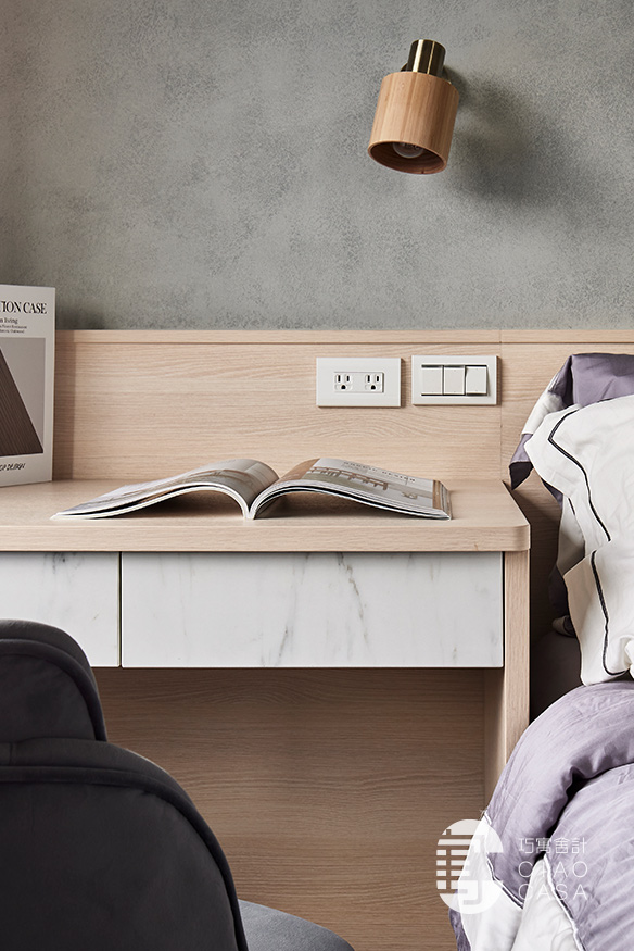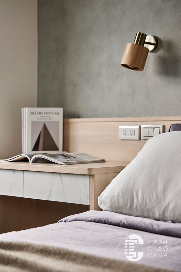 走過方才輕淺的灰色質蘊,由床頭背板、梳妝台、床頭櫃一體成形的設計,佐以暖潤的木質語彙,溫柔地鋪陳出舒眠氣氛。在乎美感細節的設計師,於櫃面及電視層架施覆同款石紋貼皮,透過元素疊合的情景,同步梳理視覺表象與心理內在的秩序。