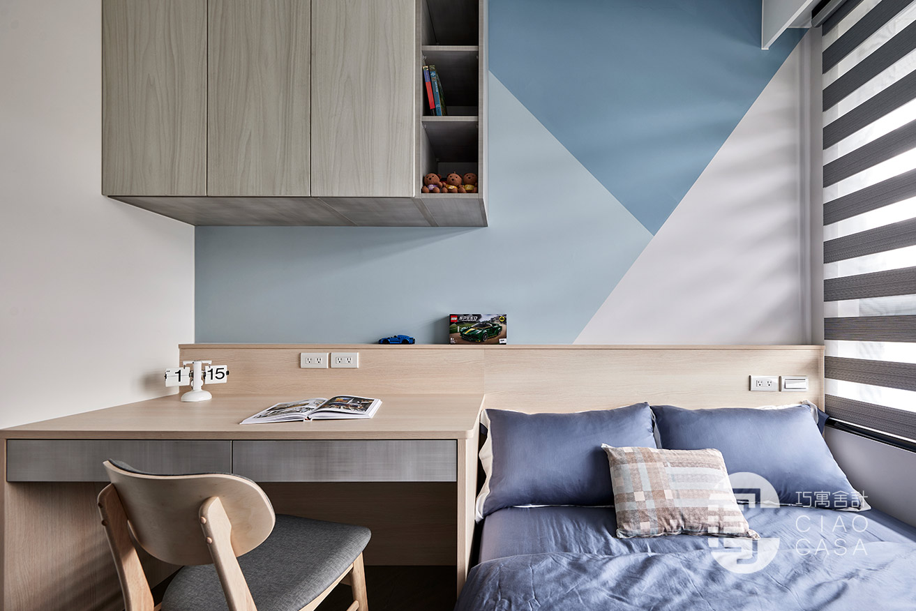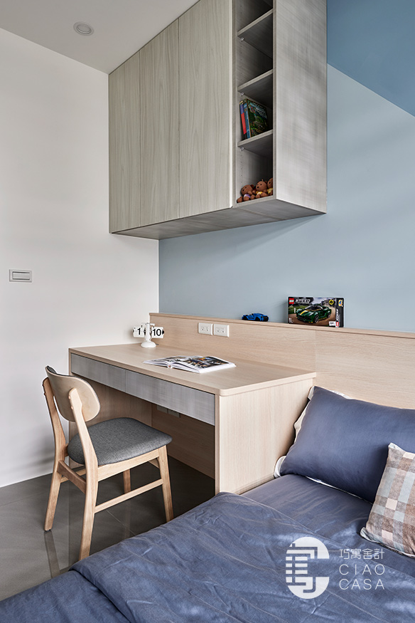 處於幼齡階段的兩個小男孩,彼此在同一房間依偎相伴,空間選用彩度柔和的藍色,以深淺交錯的手法玩轉幾何趣味。床頭一側,設置了可容納兩個座位的書桌,以及輕量化視覺的上櫃,還給臥房舒適無壓的睡眠環境。