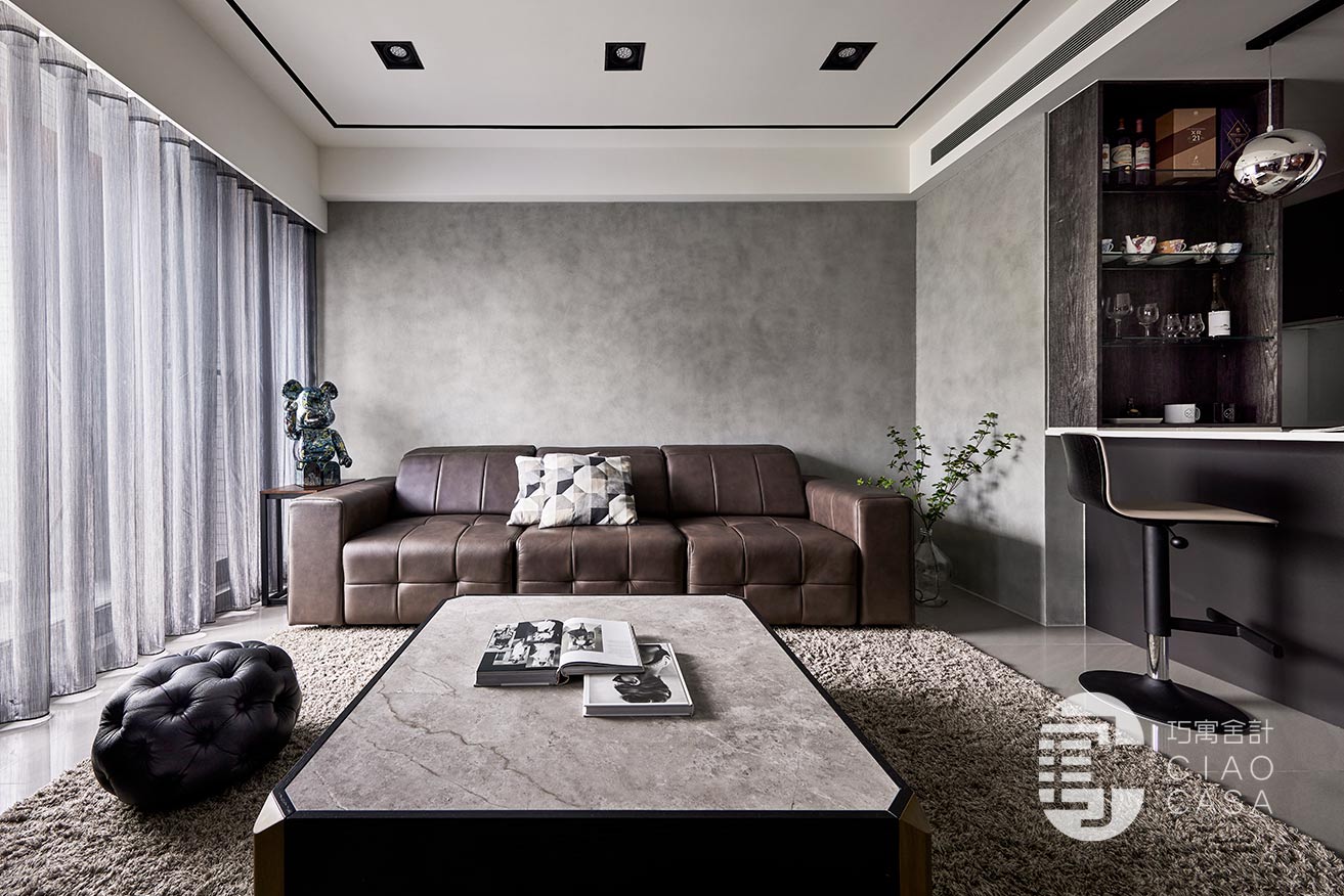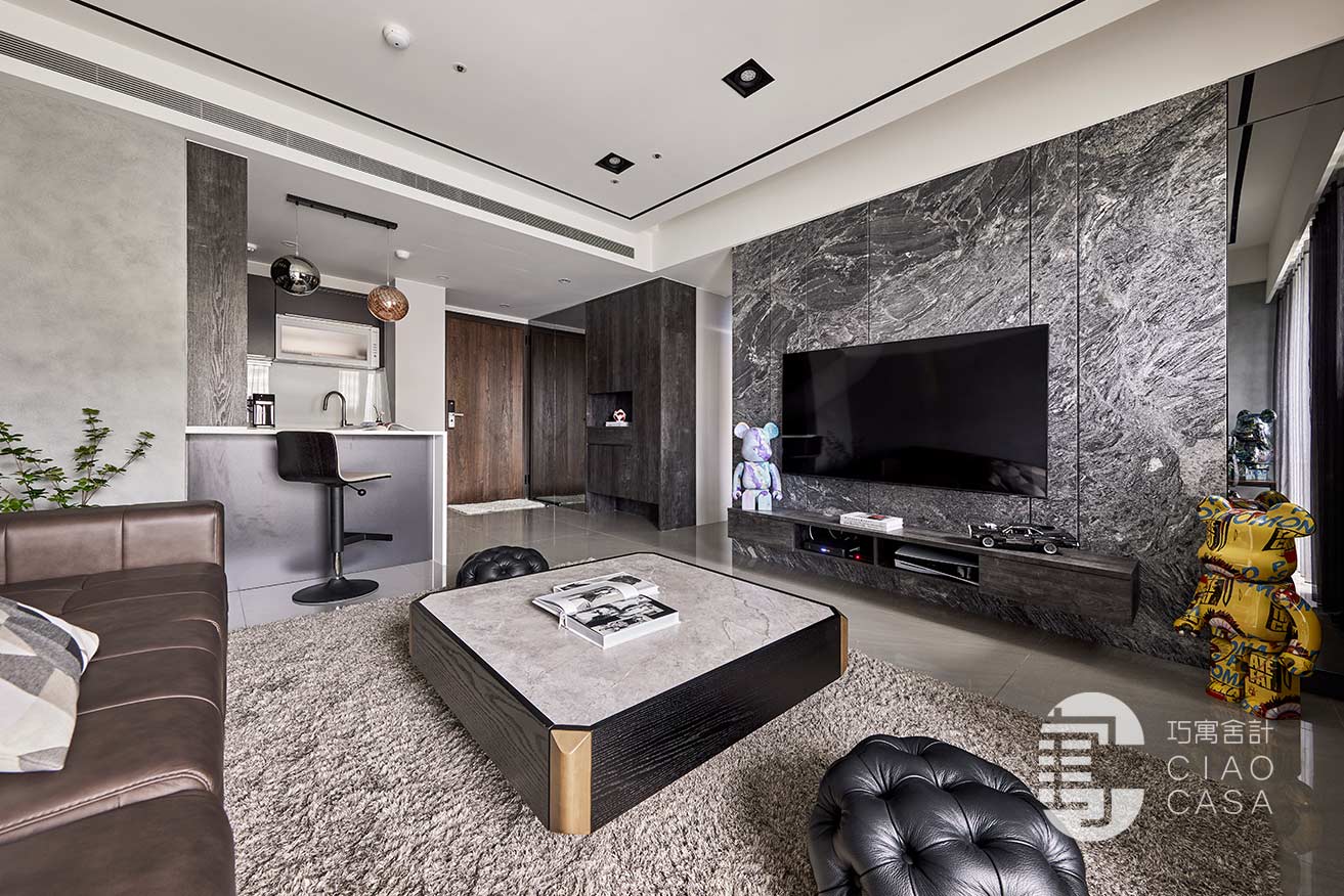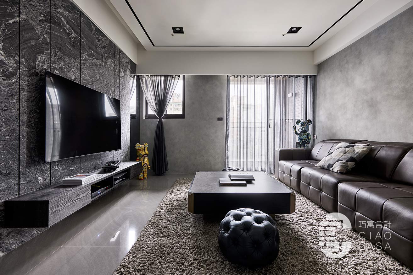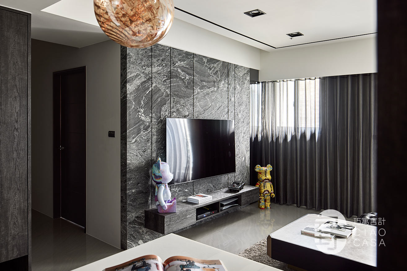 沉著雅致的調性,電視主牆採用名為「潑墨山水」的花崗岩構築,隨著繾綣如墨的紋理,攤開一幅奢雅麗景,輔以寬窄線條分割,體現獨具一格的審美品味。沙發區更借助清水模塗料的樸質樣貌、皮革傢俱的個性表現,來呼應石材的率性之美。