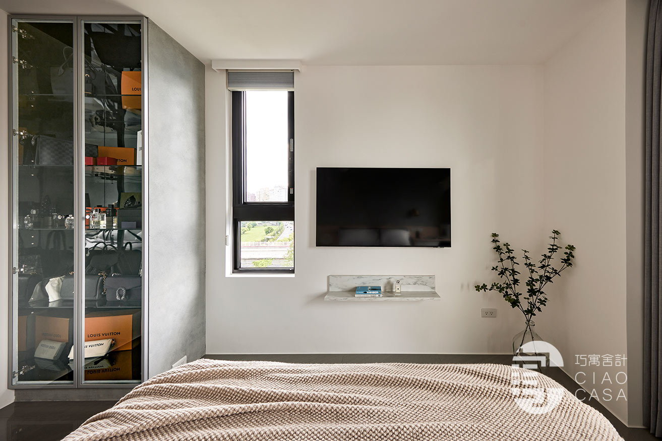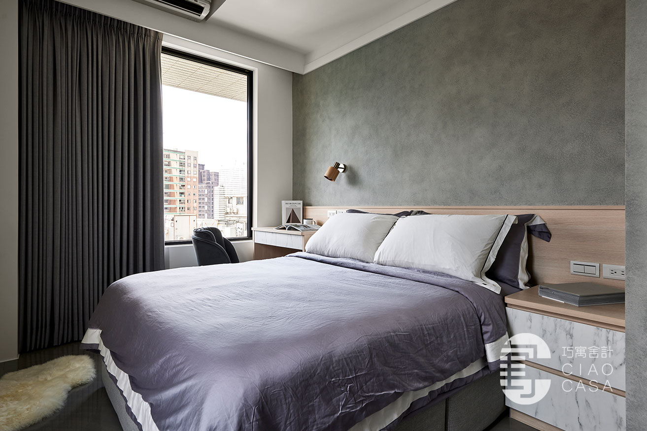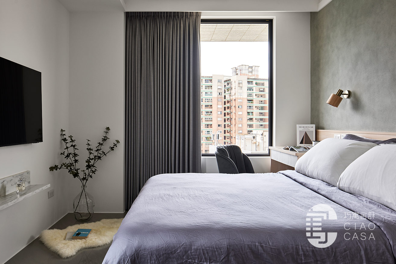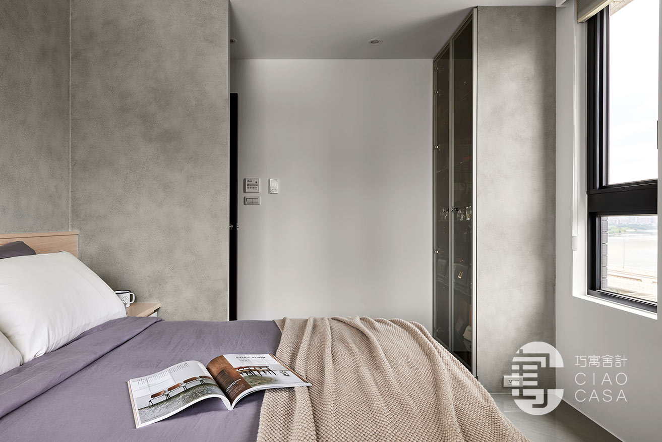 考量主臥房門通常處於敞開的狀態,設計師採用清水模塗料鋪敘立面,與客廳串聯一氣、首尾呼應,並以短牆隔斷臥床與浴門的對視,解決風水上的疑慮。