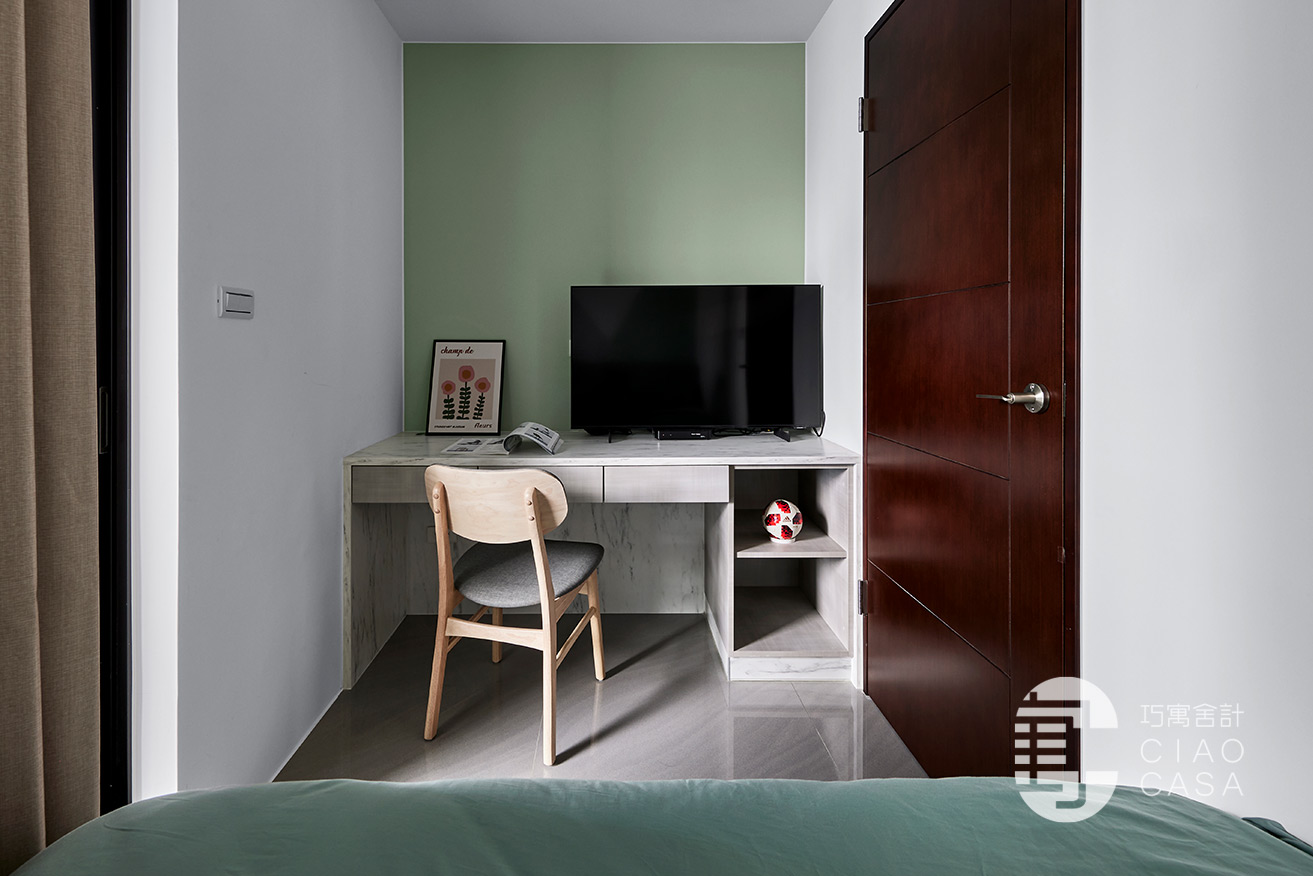 兼具客房及未來弟弟房使用的空間,不受狹窄型態的框限,將休憩的臥床、學習書桌等生活機能植入,滿足日常一切所需,同時以墨綠色為媒介,繫起床頭、床尾的連結性。