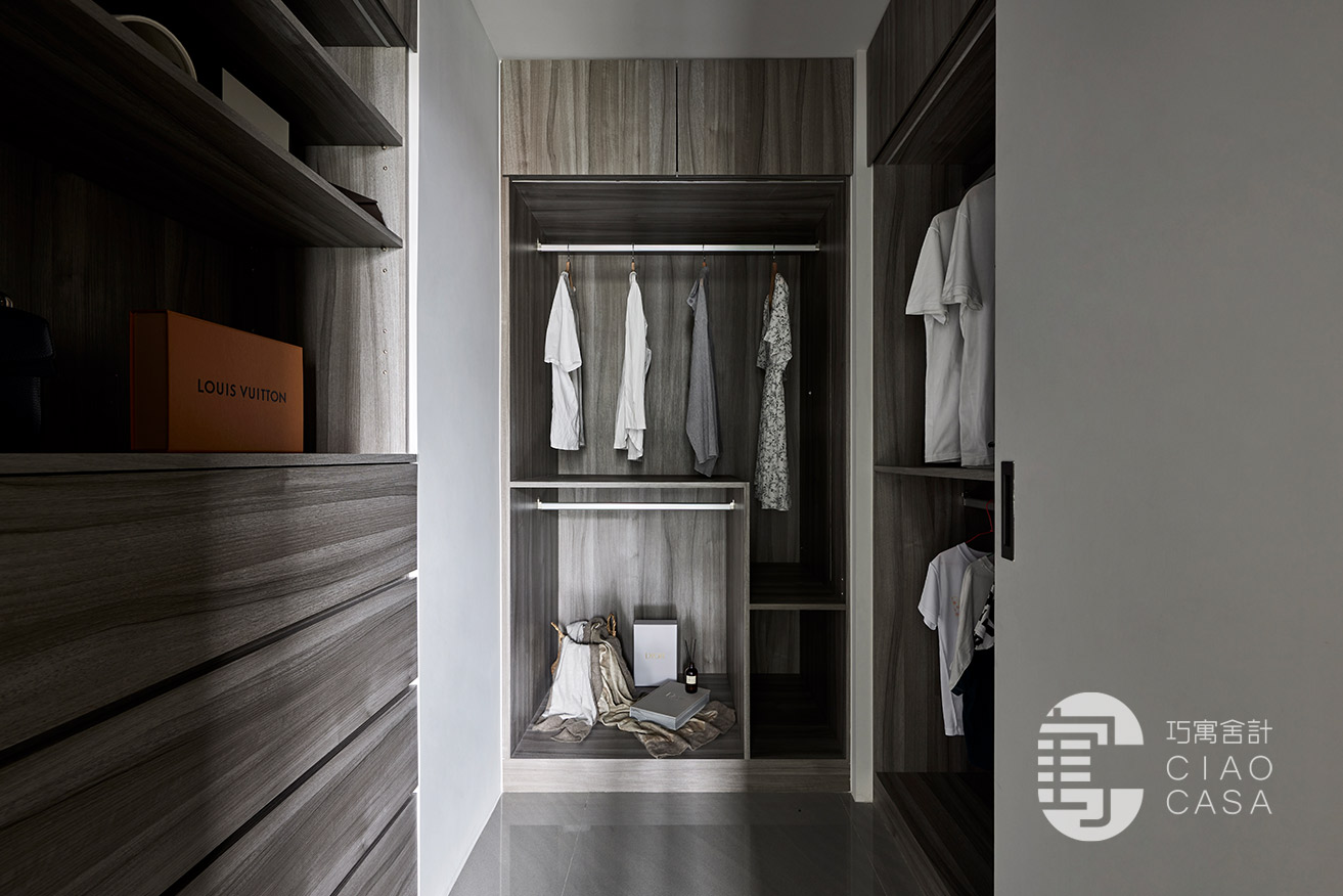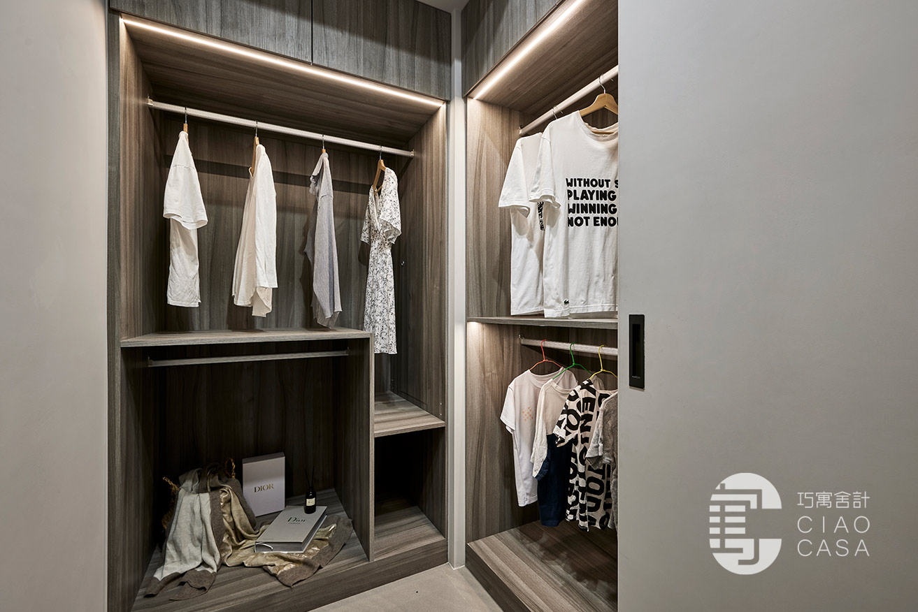 由於屋主希望更衣間能獨立出來,設計師遂重新切分格局配置,打造一間兼具儲物與更衣的空間,並將收納機能集中於此,降低大型量體佔據家中的比例,賦予整體開闊的寬適感,而內部櫃體則利用燈帶收邊,呈現俐落的現代樣貌。
