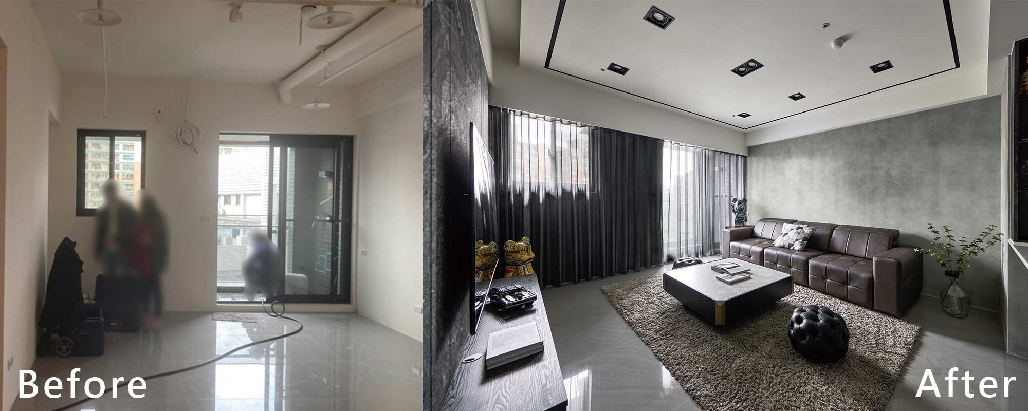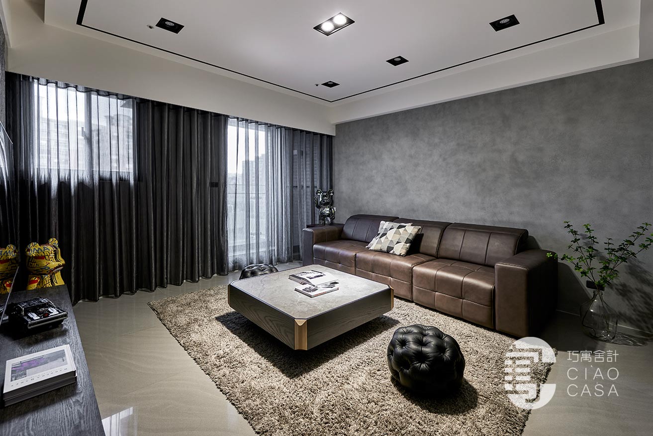 從玄關踏入客廳,天花由低至高逐漸推升,緩緩打開朗闊視野,設計師以溝縫漆黑的方式,勾勒出簡潔的場域輪廓,同時藉著間接燈光微幅推高的層次,精心雕琢出場景與心境的融徹。一席輕透柔軟的黑色窗紗,篩濾進煦煦日光,既不破壞整體的美感,也平添幾分溫暖的感受。