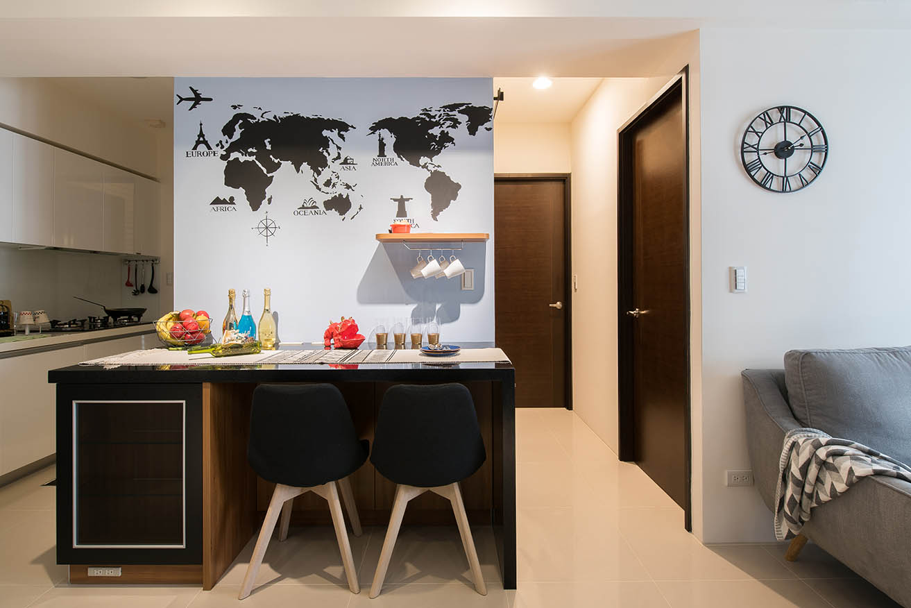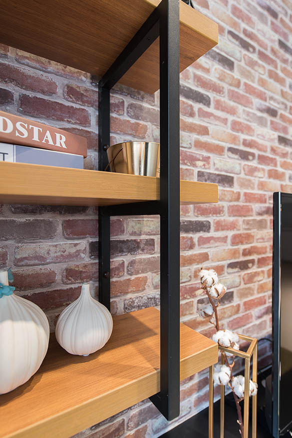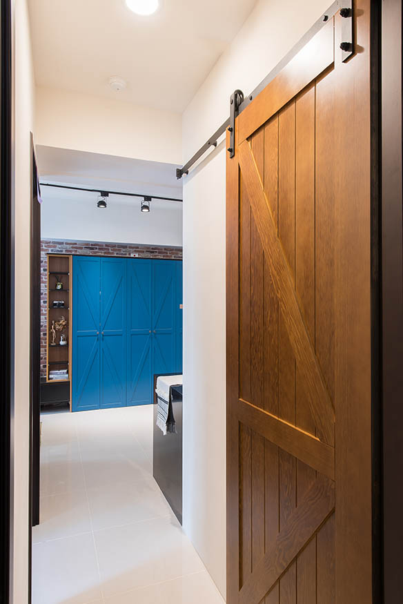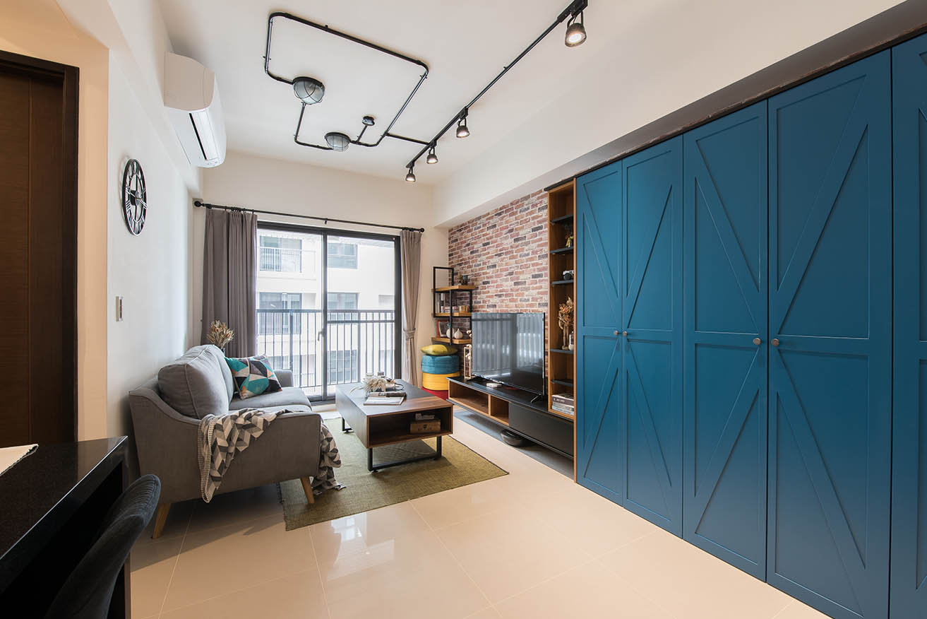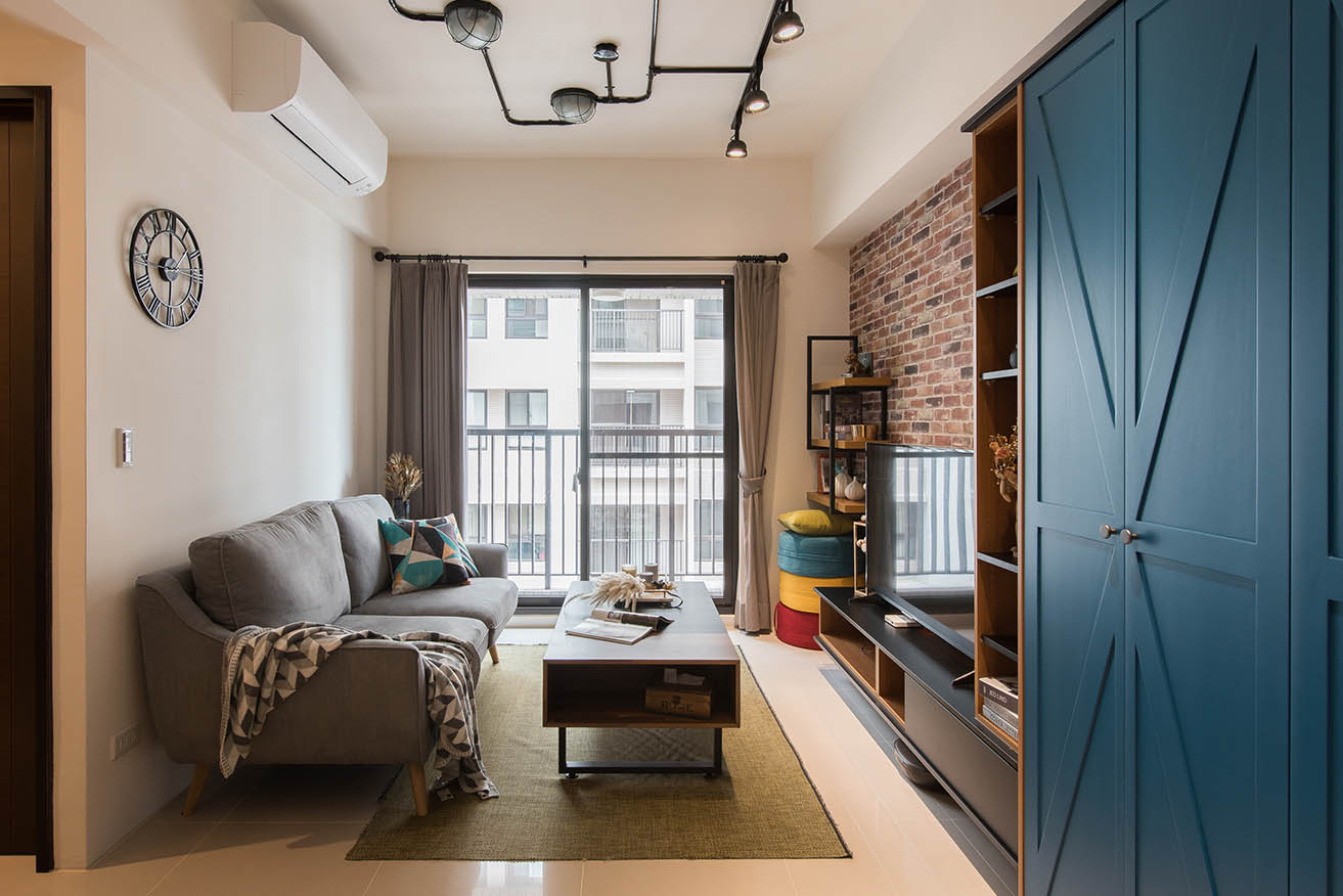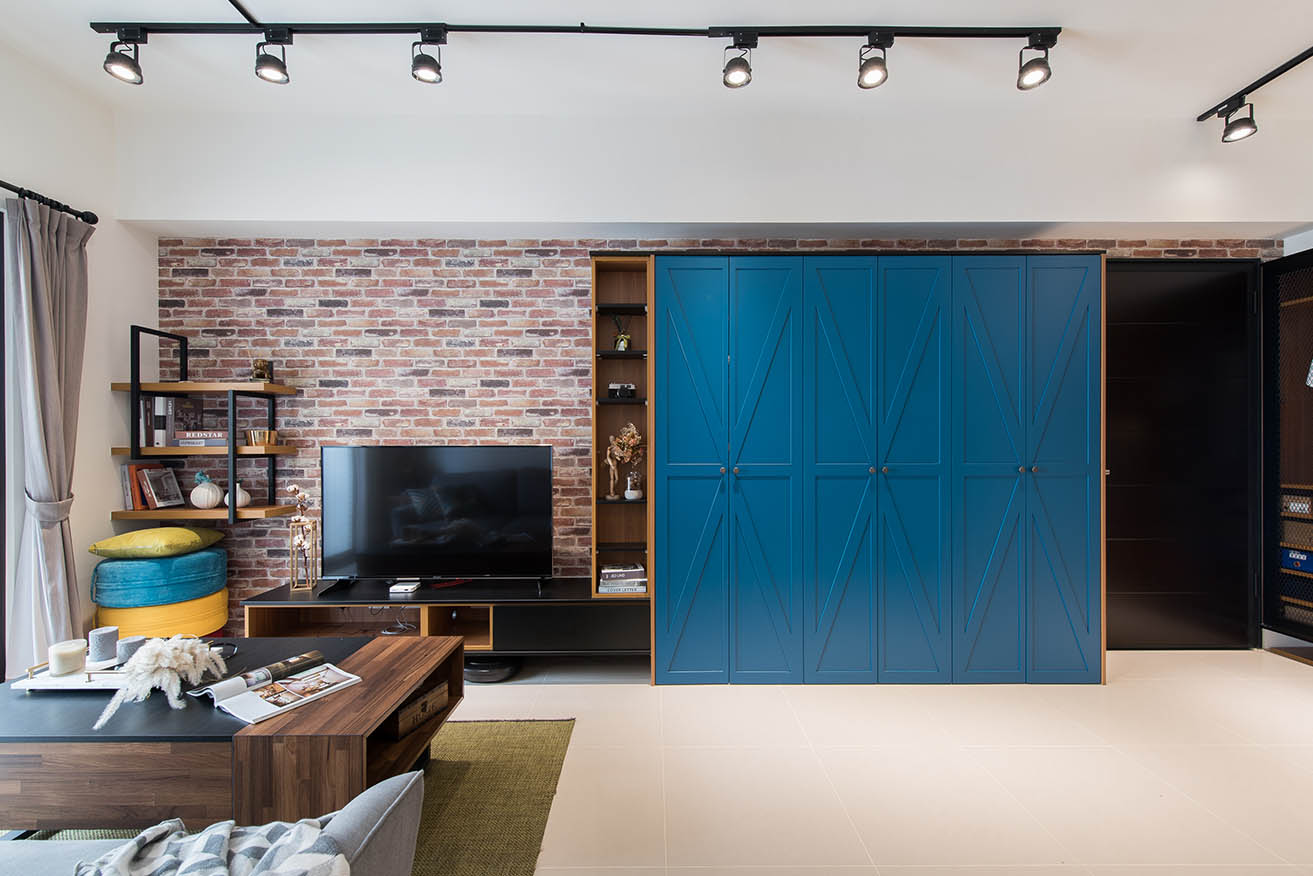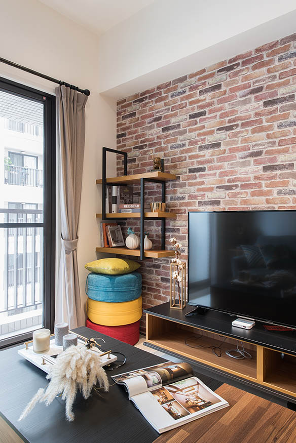 工業風鐵件、軌道燈具、日本進口紅磚色壁紙、倉門滑軌、牆面油漆、系統櫃、手繪世界地圖、穀倉風門片、窗簾、層板