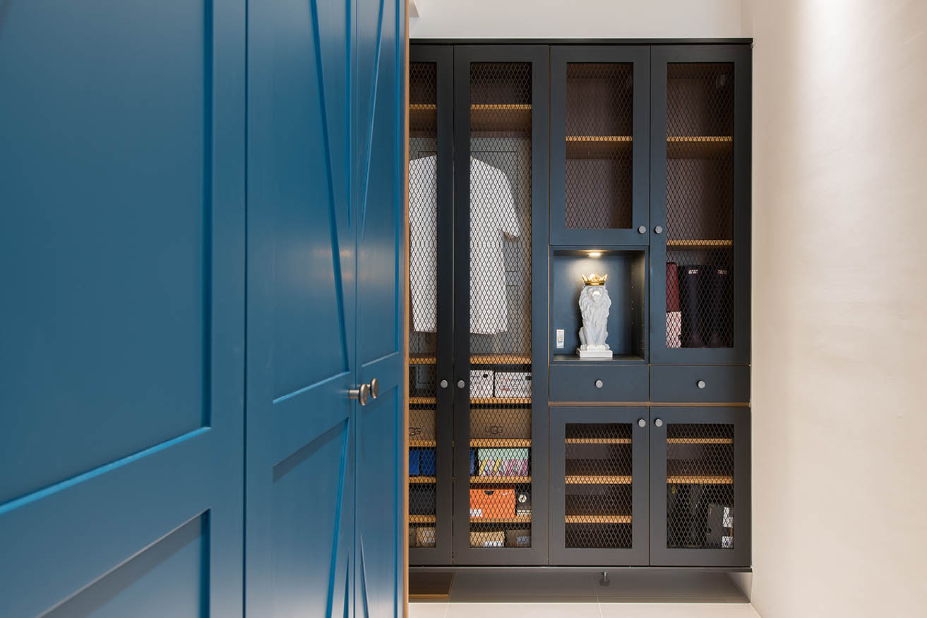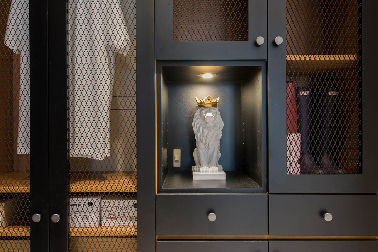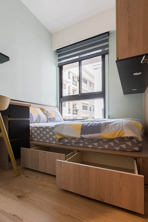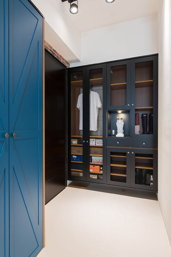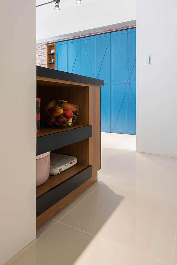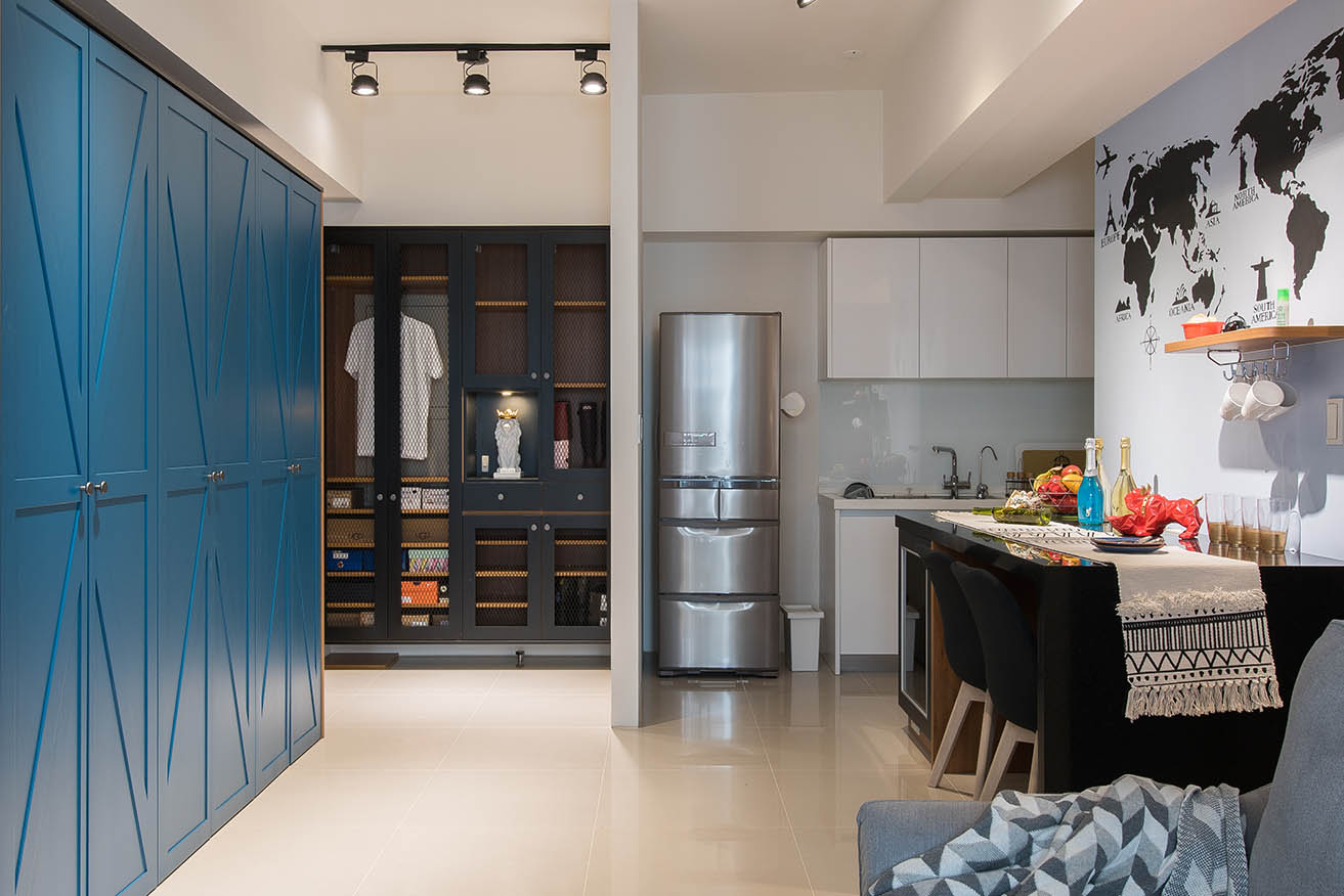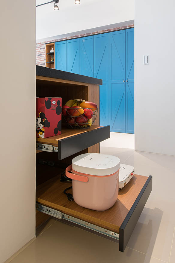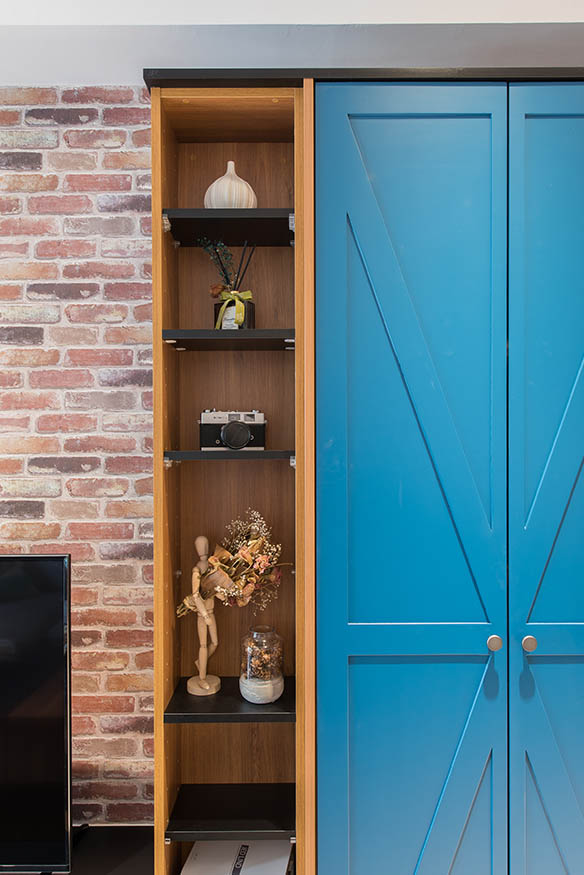 工業風鐵件、軌道燈具、日本進口紅磚色壁紙、倉門滑軌、牆面油漆、系統櫃、手繪世界地圖、穀倉風門片、窗簾、層板